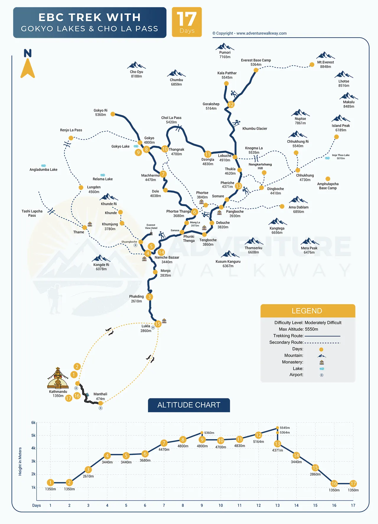 Route Map of Everest Base Camp Trek with Gokyo Lakes and Cho La Pass